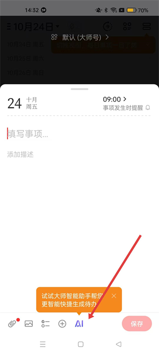 3、添加待辦事項時,可填寫事項和添加描述,還能使用大師智能助手AI功能,助力更智能快捷生成待辦,填寫完成后點擊保存即可。