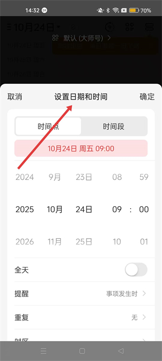 4、設置待辦事項時,可設置日期和時間,選擇時間點或時間段,還能設置提醒和重復等選項,方便對事項進行精準時間管理。