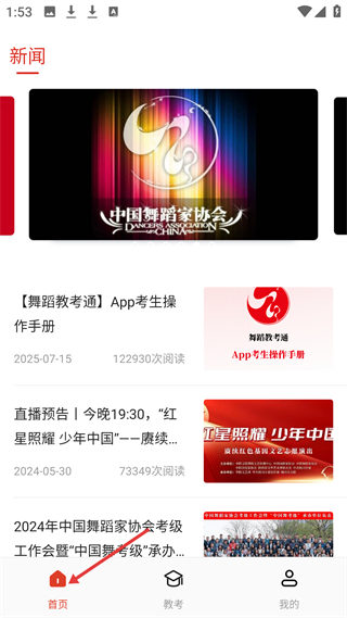 1、首頁有中國舞蹈家協會相關新聞,如舞蹈教考通App考生操作手冊等,底部可切換首頁、教考個人頁面。