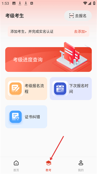 2、教考頁面為考級考生服務,可添加考生、實名認證,能查詢考級進度、報名流程,還可了解下次報名時間、進行證書糾錯。
