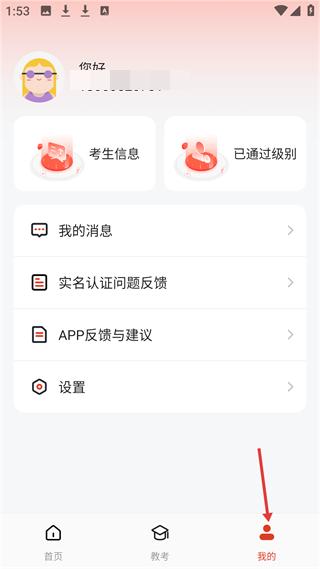 4、我的頁面顯示用戶信息,可查看考生信息、已通過級別,能接收消息,反饋實名認證、APP使用問題,也可進入設置界面。