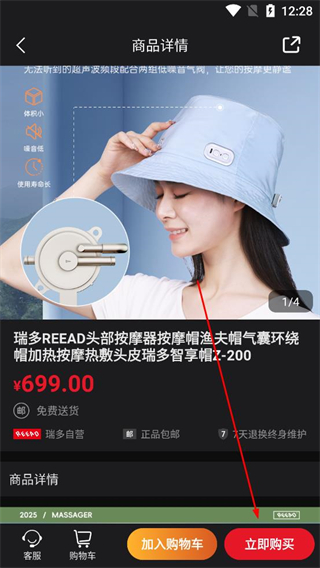 4、在商品詳情頁查看商品的功能介紹和價格信息,點擊立即買按鈕,進入商品的購買流程。