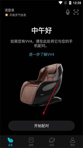 1、進入設備頁面,查看VV4設備的配對提示,點擊開始配對按鈕,啟動設備與手機的配對流程。