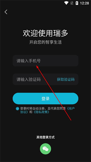 3、進入登錄界面,用戶可輸入手機號,點擊獲取驗證碼,填寫驗證碼后,勾選同意用戶協議和隱私政策,再點擊登錄按鈕登錄。
