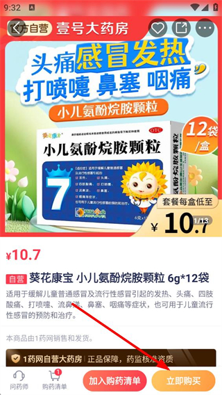 4、在藥品詳情頁,可看到如小兒氨酚烷胺顆粒的藥品信息,包括適用癥狀、價格、規格等,還有加入購物清單和立即購買按鈕,方便用戶選購藥品。
