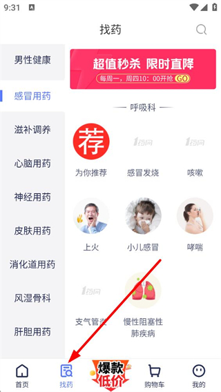 2、點擊底部找藥選項,進入找藥界面,左側有男性健康、感冒用藥等分類,右側有超值秒殺活動。