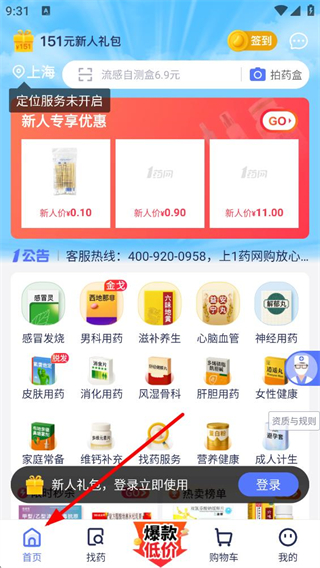 1、進入應用首頁,可見151元新人禮包、簽到按鈕,還有定位、搜索框、拍藥盒功能,下方有各類用藥分類入口。