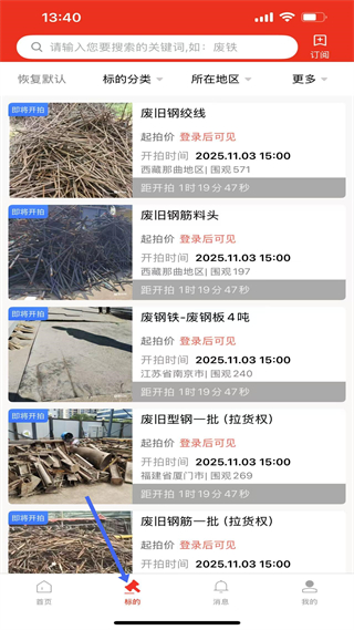 2、標的板塊,可按分類地區篩選,展示廢舊鋼絞線等拍賣標的,標注起拍價開拍時間及圍觀人數,方便用戶查找拍賣標的。