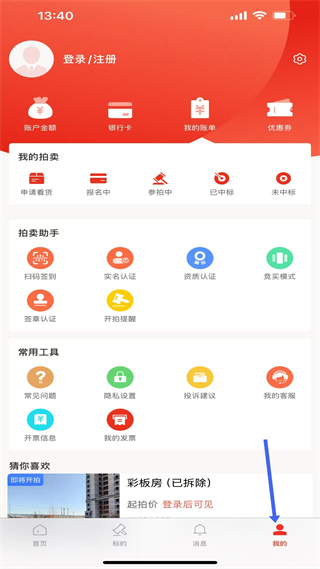 4、我的板塊,提供登錄注冊入口,有賬戶金額等功能,還有拍賣助手服務入口,支持實名認證與客服咨詢,呈現用戶管理與拍賣功能內容。