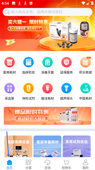 一站式自營電商平臺,醫械購app擁有全新首頁,智能搜索讓你快速找到心儀商品,輕松購物,app的9大分類,精挑細選,讓醫療耗材采購更簡單。