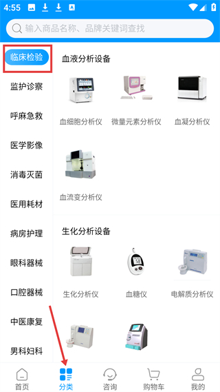 3、分類板塊,細分臨床檢驗等品類,臨床檢驗類涵蓋血細胞分析儀等設備,方便按品類查找醫療采購商品。