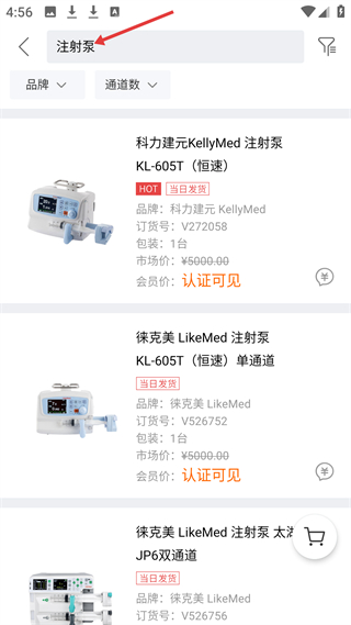 4、商品列表頁,展示注射泵類商品,包含科力建元等品牌,標注市場價格及當日發貨信息,可選購醫療設備。