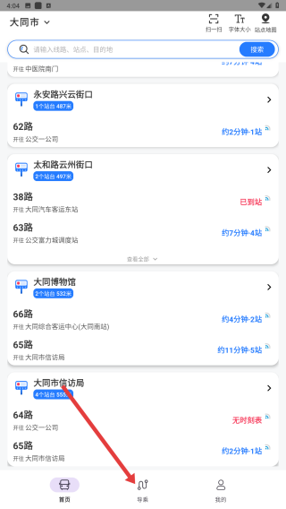 1、打開公交查詢應用,在首頁可查看大同市的公交站點及路線信息,若要進行導乘,點擊底部導乘按鈕。