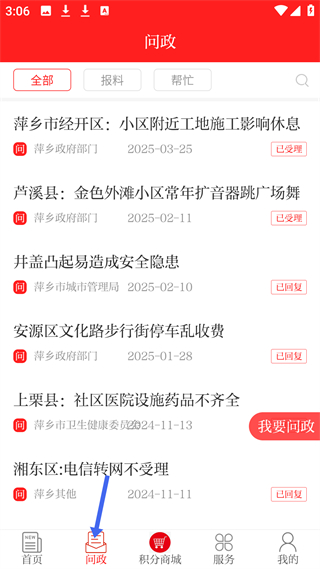 2、問政板塊展示經開區工地施工、廣場舞擾民、井蓋隱患等問政內容,用戶可參與問政并及時獲取政務府部門回復。