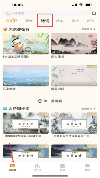 2、詩詞模塊主頁有熱門詩詞和同步學內容,可換一批刷新資源,還能切換至其他學習板塊適配需求。