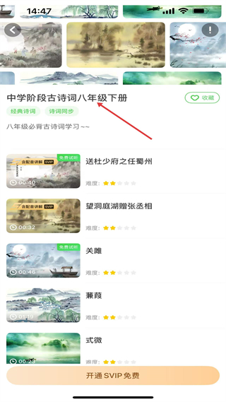 3、詩詞專輯頁按學段分類,展示對應必背詩詞,標有難度等級,部分可試聽,完整資源需開通SVIP。