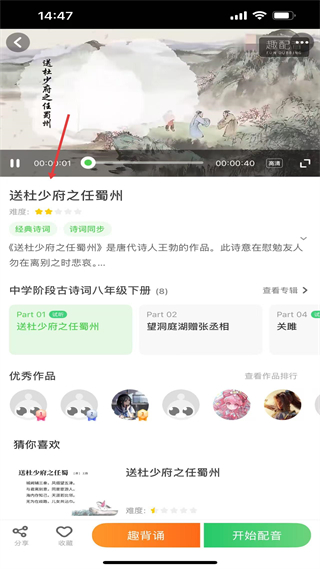 4、詩詞詳情頁含講解與音頻,支持背誦和配音操作,還展示優秀作品,以互動形式提升學習趣味。