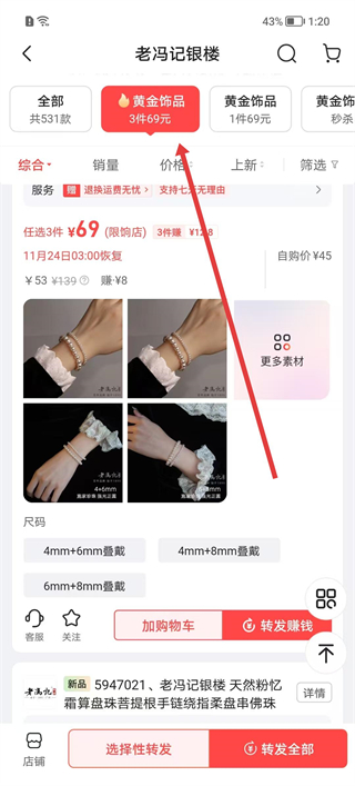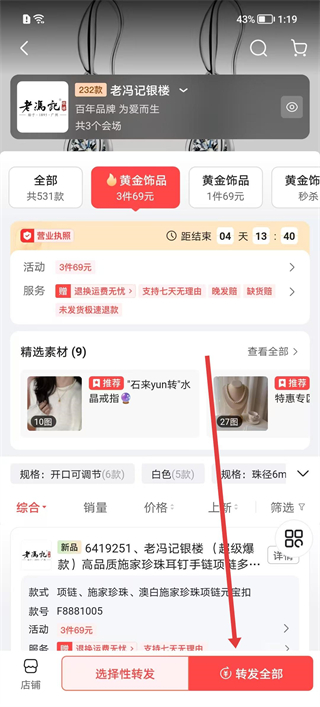 3、在商品會場頁查看商品的活動、服務等信息,瀏覽精選素材,選擇目標商品后點擊選擇性轉發按鈕。