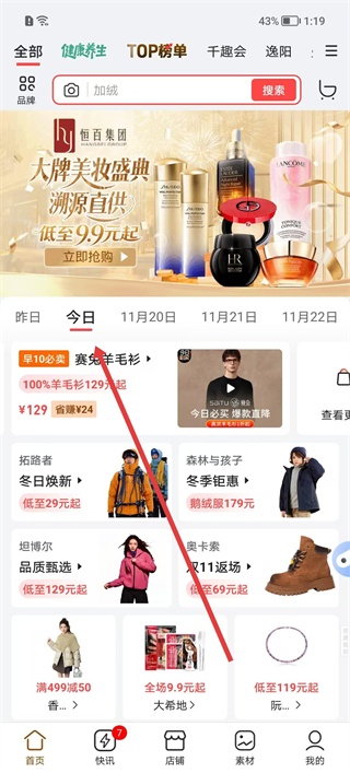 1、打開愛庫存軟件首頁,瀏覽今日推薦的商品,選擇目標商品分類,進入對應的商品列表頁面查看更多商品。