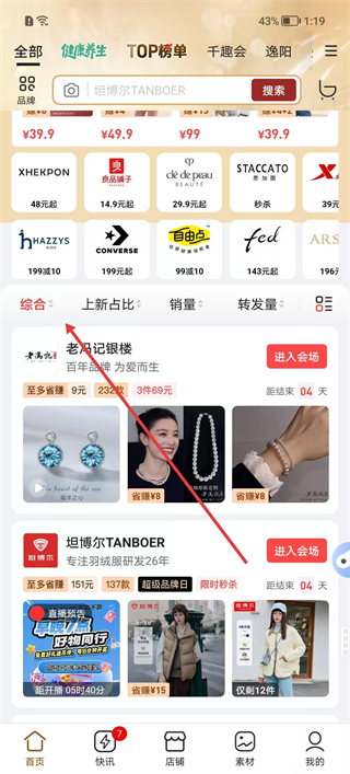 2、在商品列表頁切換至上新占比等排序方式,選擇想要查看的商品,點擊進入該商品的會場頁面。