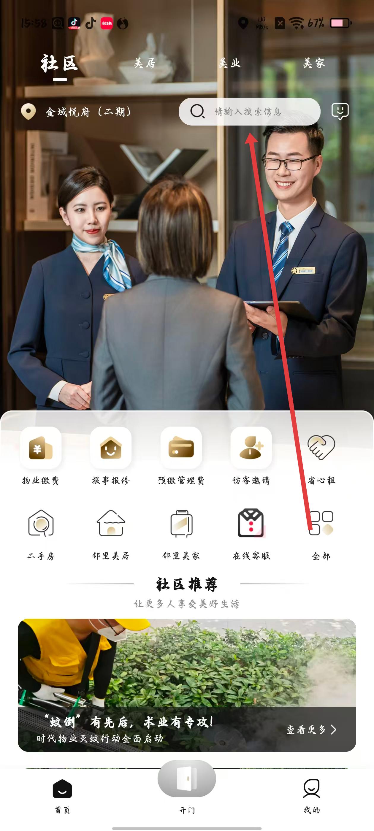 1、進入社區頁面可查看物業繳費、報事報修等服務功能,點擊搜索框可搜索所需服務。