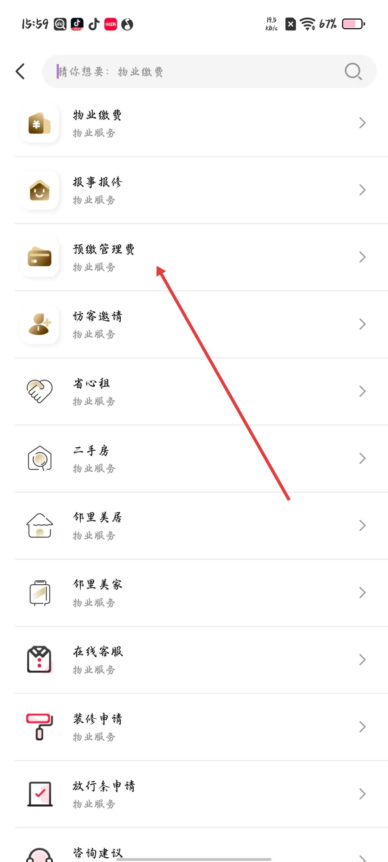 2、在服務列表頁面可查看物業繳費、預繳管理費等服務,選擇預繳管理費服務點擊進入。