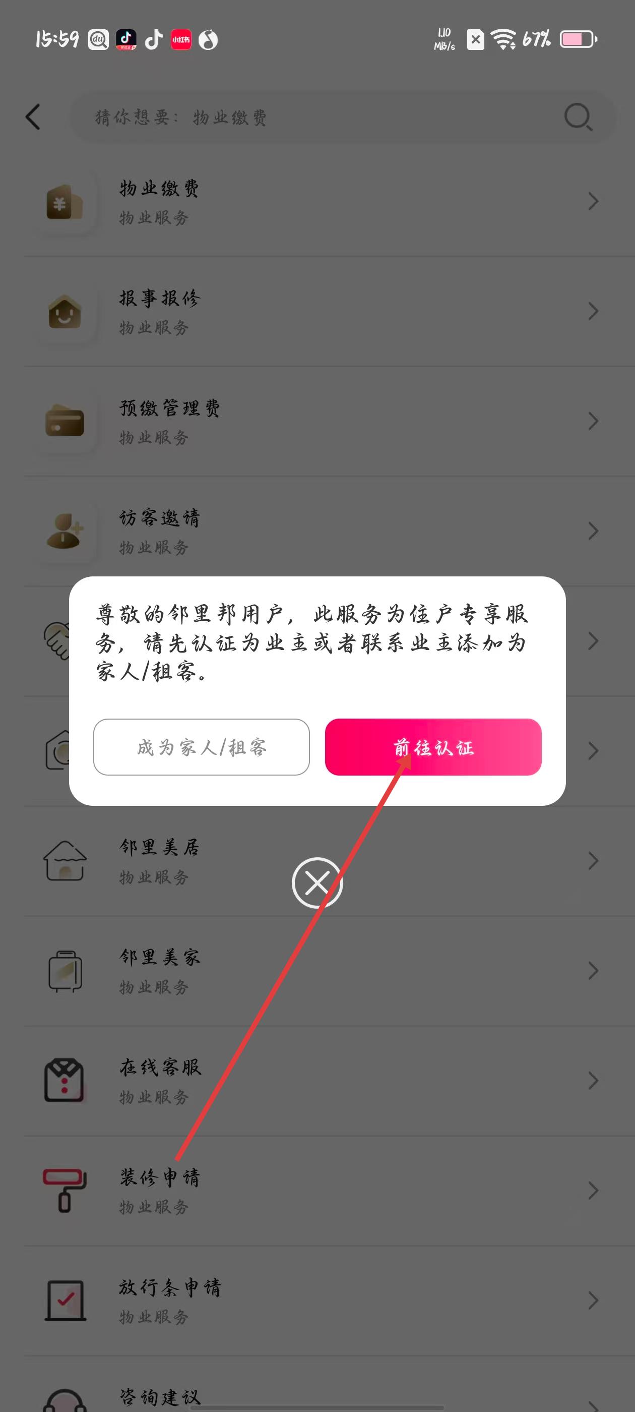 3、點擊預繳管理費后會彈出認證提示框,點擊前往認證可進入業主認證頁面。