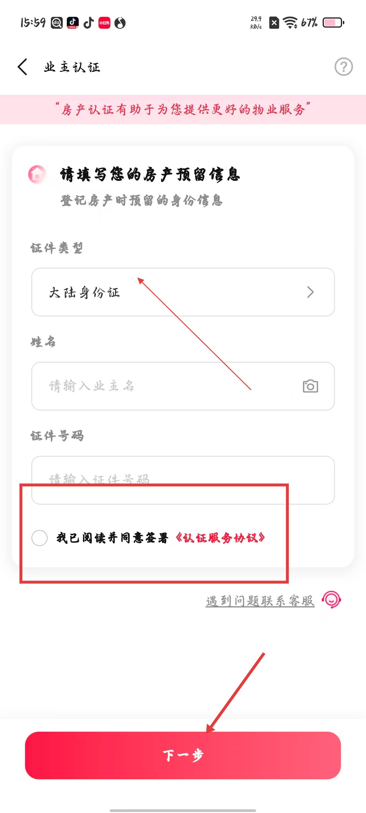 4、在業主認證頁面選擇證件類型,填寫姓名和證件號碼,閱讀并同意認證服務協議后點擊下一步,完成業主認證以便使用物業專享服務。