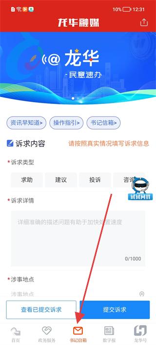 3、點擊書記信箱,進入民意速辦頁面,可填寫訴求內容,選擇訴求類型,如求助、建議等,輸入訴求詳情和涉事地點,提交訴求,反映民意。