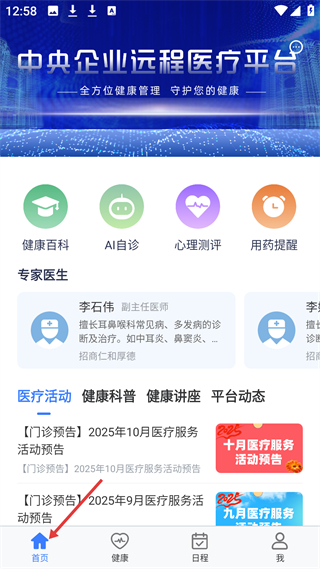 2、首頁是中央企業遠程醫療平臺,有健康百科、AI自診等功能,還有專家醫生和醫療活動預告,提供全方位健康管理。