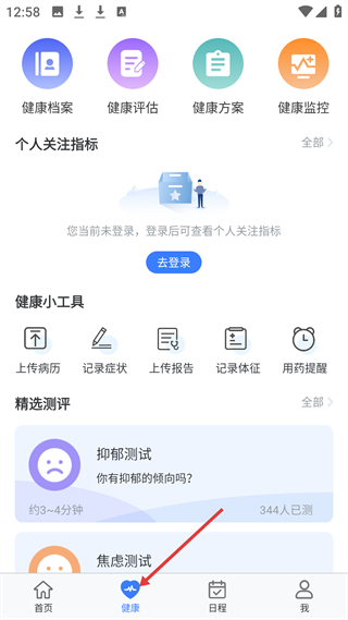 3、健康板塊有健康檔案、健康評估等功能,健康小工具可上傳病歷、記錄癥狀,還有抑郁測試等測評,助力健康監測。