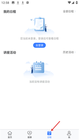 4、日程板塊可查看我的日程和講座活動,登錄后可使用相關功能,助力健康管理與日程規劃,提升健康管理效率。
