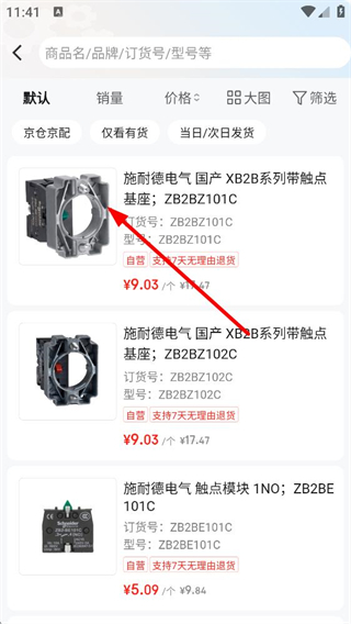 2、商品列表頁面,可通過銷量、價格等維度排序,或篩選京倉京配等條件,選擇目標商品如施耐德電氣基座并點擊進入詳情頁。