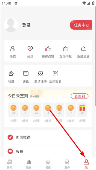 2、點擊底部我按鈕,進入個人頁面,可進行登錄,使用動態、關注等功能,還能參與簽到領金幣活動和投稿。
