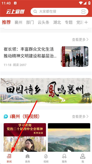 1、進入云上襄州APP新聞頁面,可看到推薦、襄州等多個欄目,還有各類本地新聞資訊和短視頻內容,能瀏覽襄州區的時政、文化等新聞。