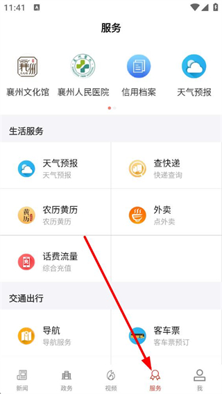 4、點擊底部服務按鈕,進入服務頁面,可使用襄州文化館、襄州人民醫院等服務入口,還有天氣預報、查快遞等生活服務和交通出行服務。