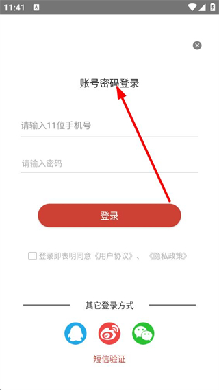 3、登錄頁面,可選擇賬號密碼登錄,輸入11位手機號和密碼,閱讀并同意相關協議后登錄,也可選擇其他登錄方式或短信驗證。