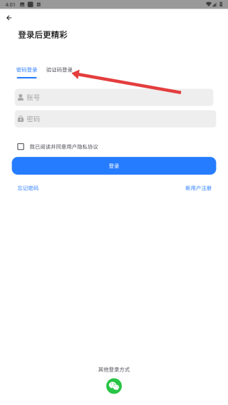 3、在登錄界面,選擇驗證碼登錄,切換到驗證碼登錄的輸入頁面。