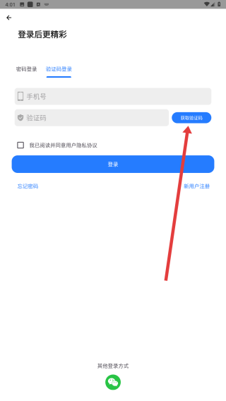 4、在驗證碼登錄頁面,輸入手機號后,點擊獲取驗證碼,等待接收驗證碼,以便完成登錄。