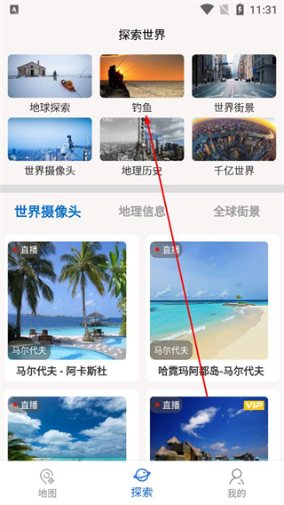 2、登錄后進入探索世界界面瀏覽各類板塊選項,找到釣魚分類并點擊,即可查看相關內容,也能選擇其他板塊如地球探索世界街景等進行瀏覽。
