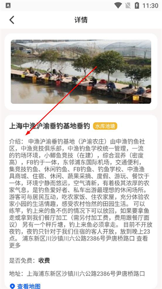 4、點擊具體垂釣地點條目進入詳情頁查看該地點的介紹信息,包括特色服務及收費情況,還能查看地址并點擊查看地圖獲取位置指引。