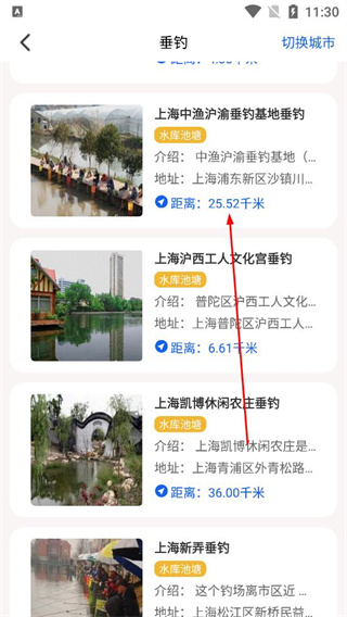 3、進入垂釣頁面查看不同垂釣地點信息,包括各地點的水位情況介紹地址及距離,可根據需求選擇合適的地點,點擊對應條目查看詳細內容。
