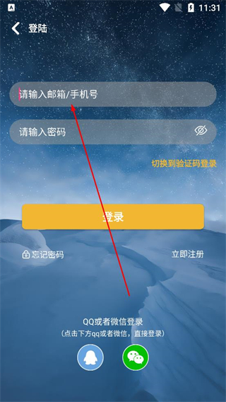 1、進入登錄頁面輸入郵箱或手機號,再填寫對應密碼,也可切換到驗證碼登錄,或選擇QQ微信直接登錄,完成信息填寫后點擊登錄按鈕進入軟件。