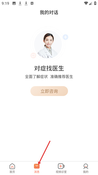 2、消息界面是我的對話板塊,可通過對癥找醫生全面了解癥狀,準確推薦醫生并立即咨詢。
