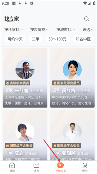 3、視頻診室能找專家,可按科室、疾病、城市篩選,有多種標簽,展示多位不同級別專家,方便用戶視頻問診。