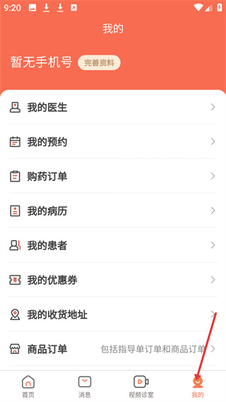 4、我的界面可完善手機號,管理我的醫生、預約、購藥訂單、病歷、患者、優惠券、收貨地址、商品訂單等。