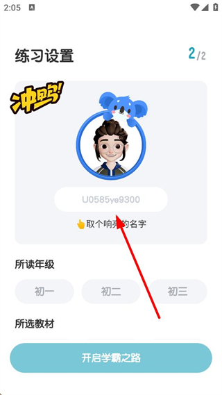 4、進入練習設置頁面,可設置昵稱、選擇就讀年級與對應教材,完成后點擊開啟學霸之路按鈕,開啟學習流程。