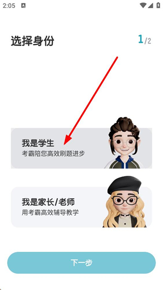 3、進入身份選擇頁面,有我是學生、我是家長、老師選項,選定對應身份后,點擊下一步進入練習設置頁面。