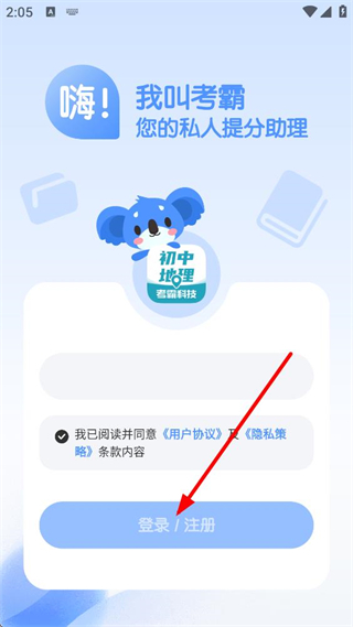1、進入考霸的初始頁面,可見我叫考霸 您的私人提分助理介紹及初中地理標識,勾選用戶協議后,點擊登錄、注冊進入賬號創建頁面。