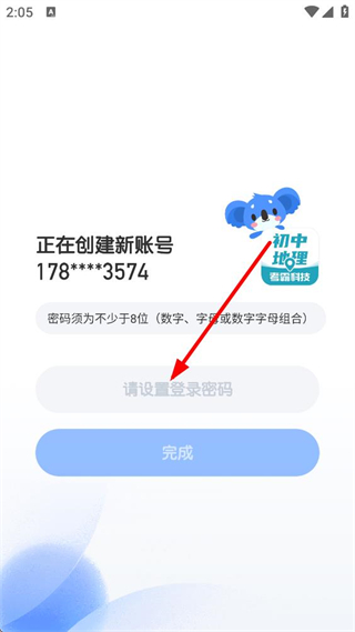 2、進入新賬號創建頁面,顯示對應手機號,按要求設置不少于8位的登錄密碼,點擊完成按鈕推進賬號創建流程。